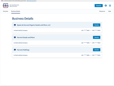The overview page united data sources from across the agency. Here, users can see all of their loans, certifications, and businesses in one central place.